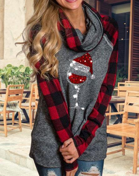 Women's Christmas Wine Glass Print Plaid Splicing Shirts&Tops