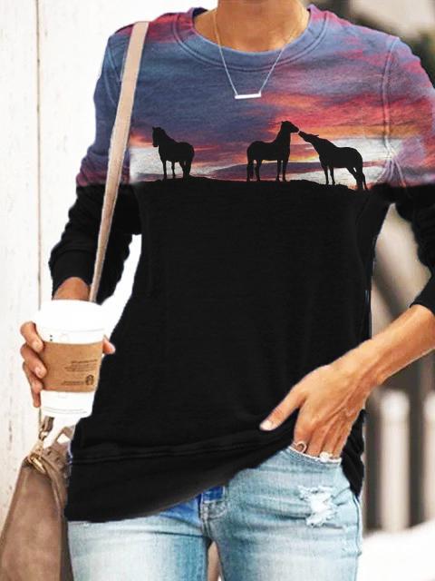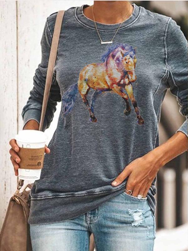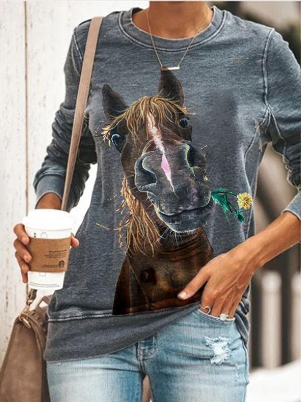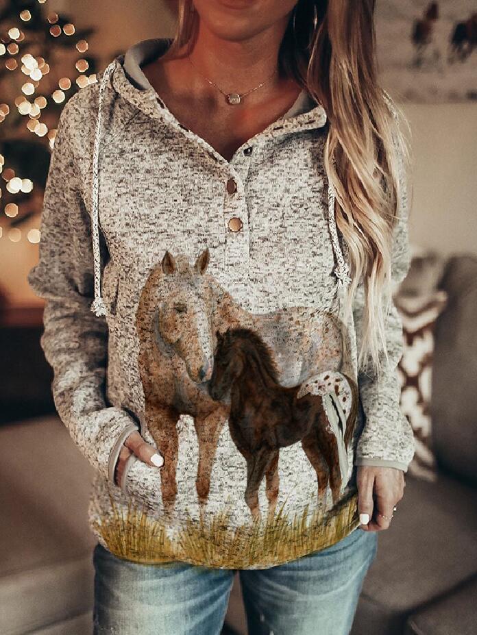 Animal Love Horse Print Long Sleeve Pullover Hoodie